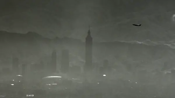 東部戰區進行「正義使命-2025」演習,解放軍無人機俯瞰台北101大廈(影片截圖) 視覺中國