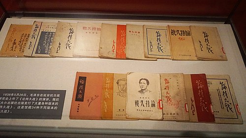 《論持久戰》是毛澤東於1938年5月26日至6月3日,在延安抗日戰爭研究會上的演講稿,是關於中國抗日戰爭方針的軍事政治著作。毛澤東在總結抗日戰爭初期經驗的基礎上,針對中國國民黨內部分人的“中國必亡論”和“中國速勝論”,以及中國共產黨內部分人輕視遊擊戰的傾向,系統地闡述了中國實行持久戰以獲得對日勝利的戰略。[ 1 ] [ 2 ]